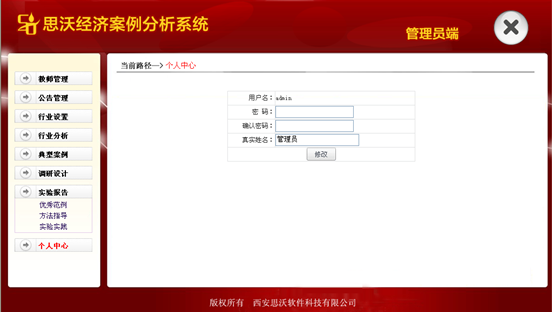 管(guan)理員端是主要進行系統的基礎數(shu)據管(guan)理和(he)設(she)置(zhi)的,其中(zhong)主要包括教師管(guan)理、公告(gao)管(guan)理、行業(ye)設(she)置(zhi)、行業(ye)分析(xi)、典型(xing)案(an)例、調研設(she)計、實驗(yan)報告(gao)、個人中(zhong)心等主要模(mo)塊。
